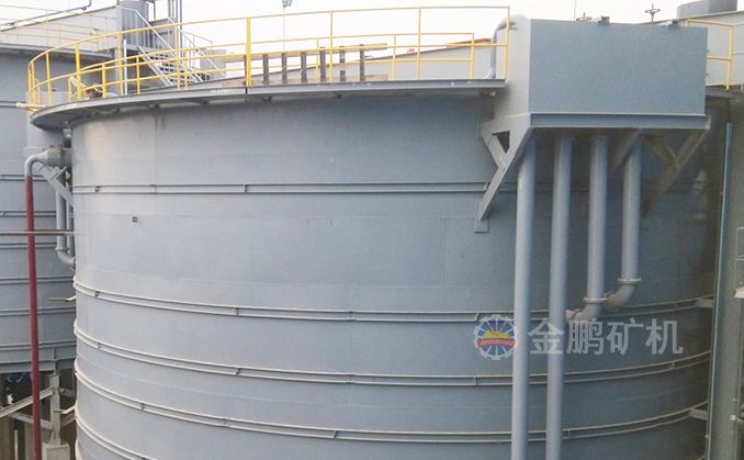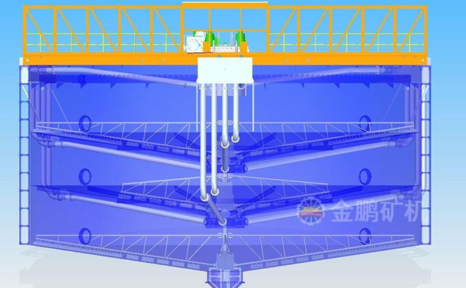 礦漿由給礦筒給入,自由沉降于耙子區(qū)的礦漿受刮板的壓力進(jìn)一步濃縮,由耙子逐漸刮向池子中心,由排礦口靠重力排入下一層池子?清水經(jīng)分配箱進(jìn)入最下層對物料進(jìn)行最后的洗滌,最下層的溢流返回分配箱進(jìn)入第二層對物料進(jìn)行洗滌,第二層的溢流返回分配箱進(jìn)入第一層對物料進(jìn)行洗滌,第一層的溢流經(jīng)溢流堰排出,經(jīng)三次洗滌的物料經(jīng)底部排出。